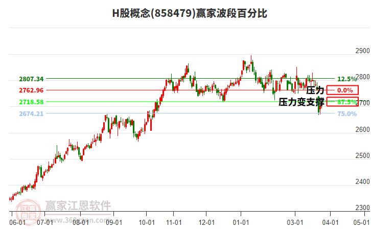 ★依据赢家江恩波段百分比工具展示:短期处于空头趋势,当前该概念处于波段百分比工具所显示的2718.58点支撑位,短期关注是否产生江恩多头信号。